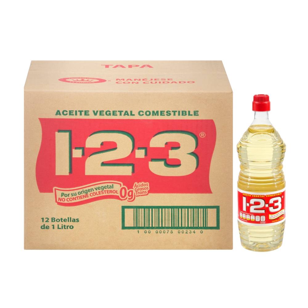 Caja de aceite marca 1-2-3 en 12 botellas de 1 litro cada una, de Fábrica de Jabón La Corona.
