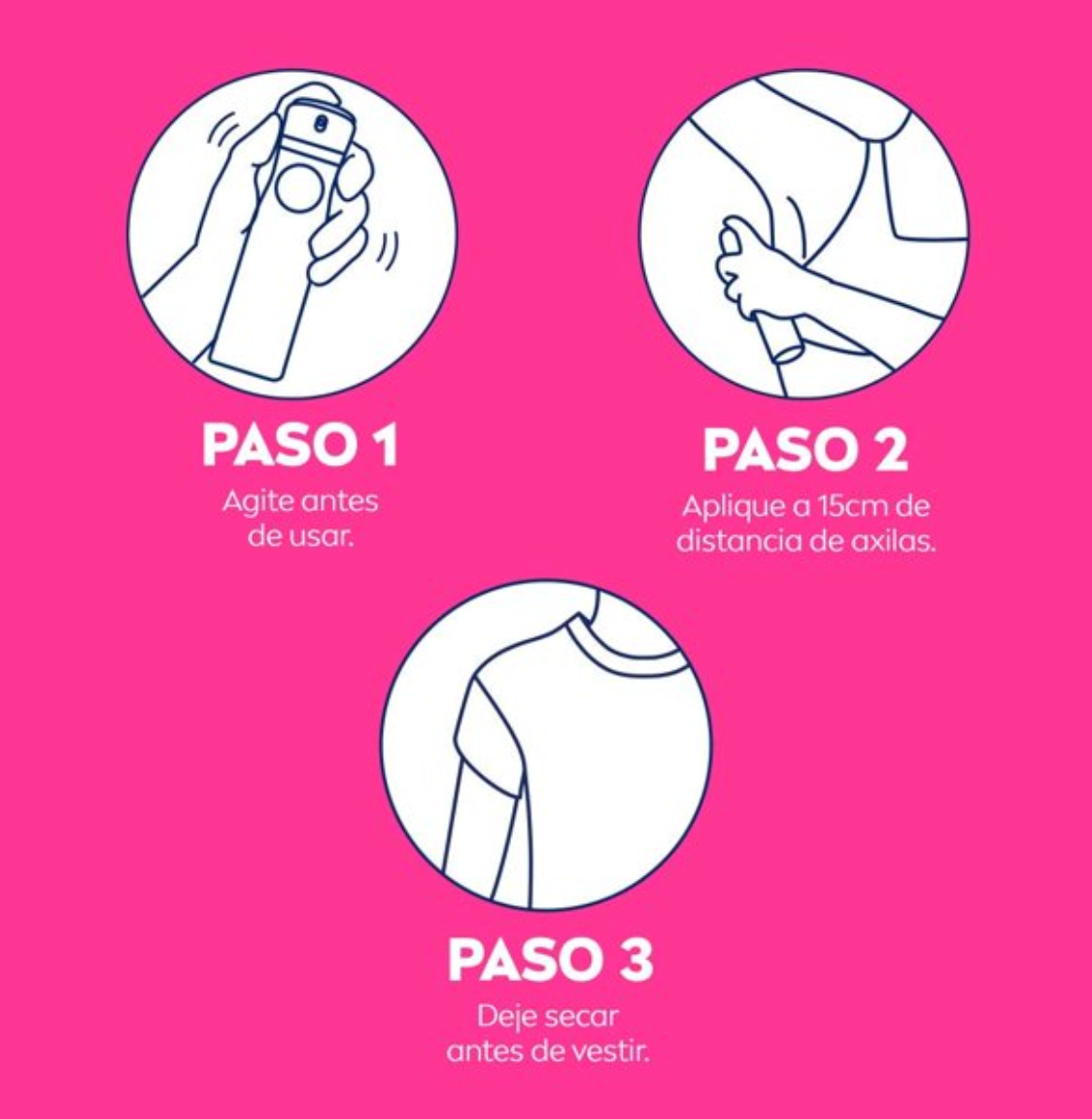 Es fácil de usar; solo tienes que agitarlo bien antes de usar, sostener el envase a 15 cm de la axila y aplicarlo, lo que permitirá que la fórmula se seque por completo antes de que te vistas.