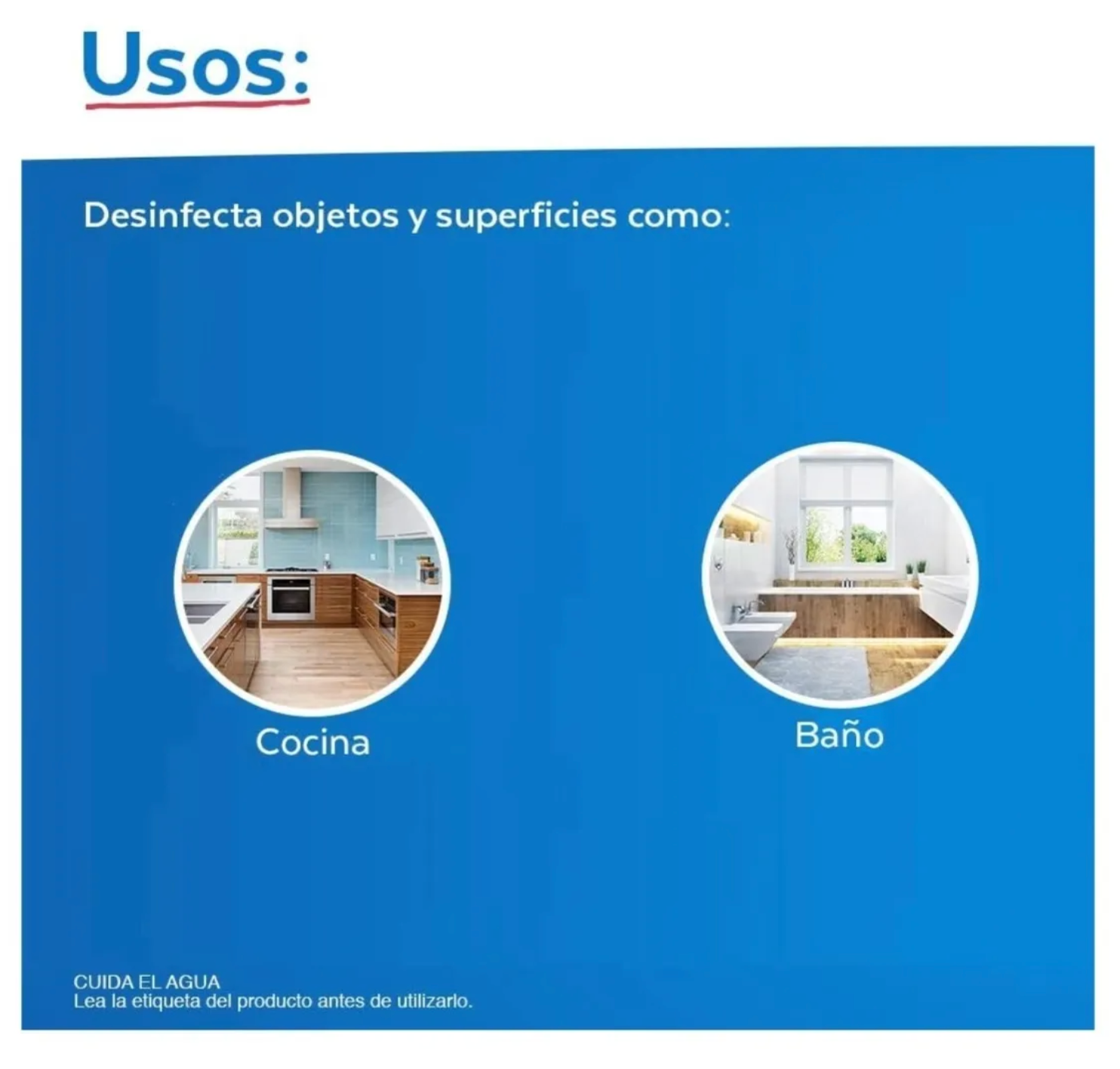 Para desinfección: Aplique el contenido puro y deje actuar durante 10 minutos, enjuague si las superficies desinfectadas entrarán en contacto con los alimentos.