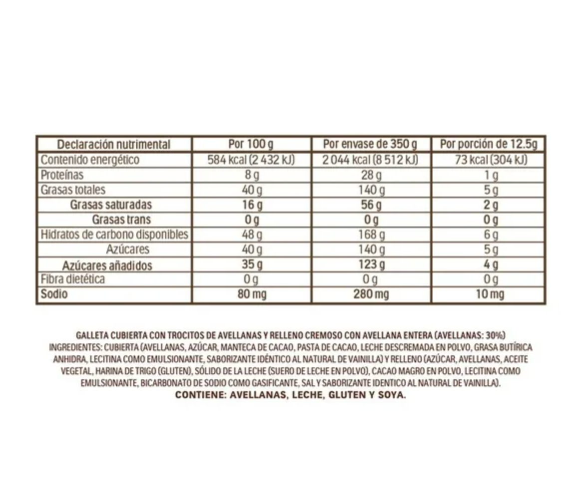 ¿A quién no le encanta su delicioso sabor? Galleta cubierta con trocitos de avellanas y relleno cremoso con avellana entera, los ingredientes que ya conoces y que tanto te encantan. Apto para regalar, disfrutar o llenar tus reuniones de un sabor delicioso.