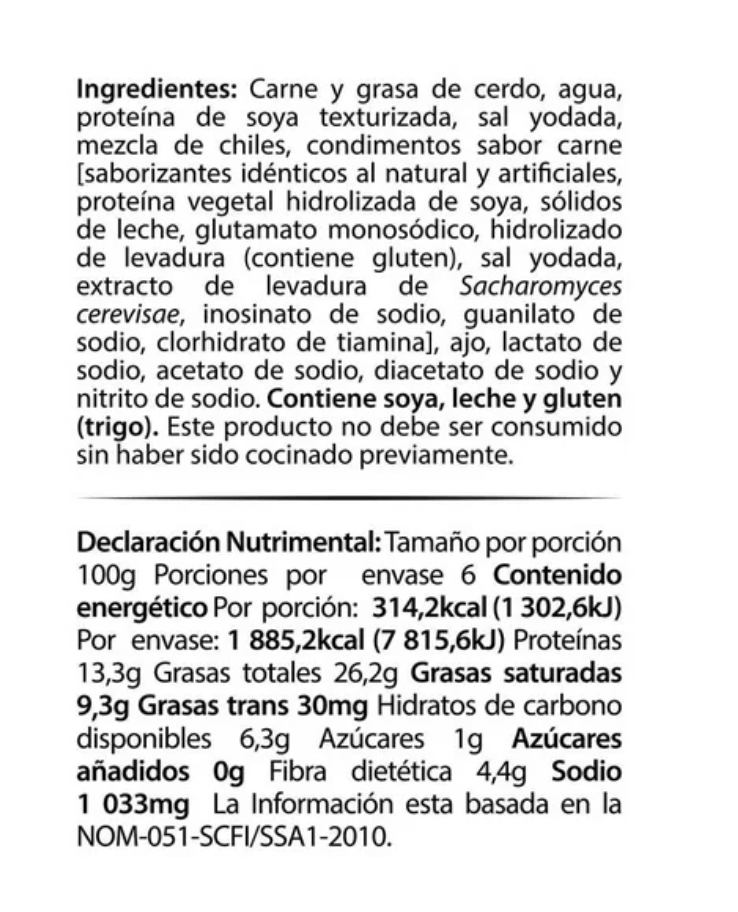 El Chorizo Ranchero de cerdo Chata es elaborado con recortes de cerdo molidos, texturizado de soya y condimentos. Es de textura granular, color naranja rojizo, sabor condimentado y ligeramente picoso.