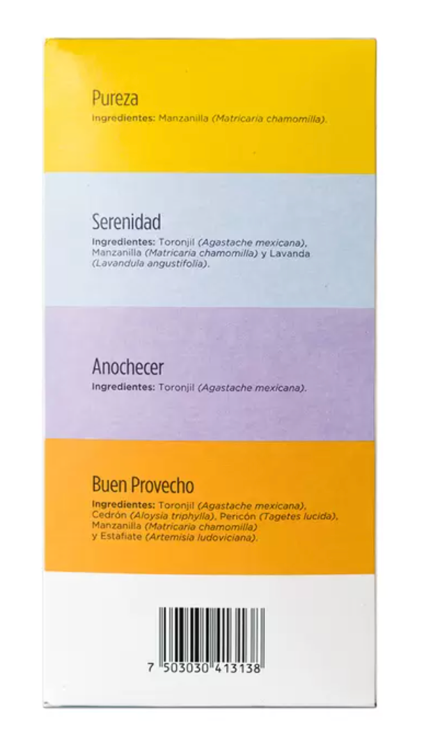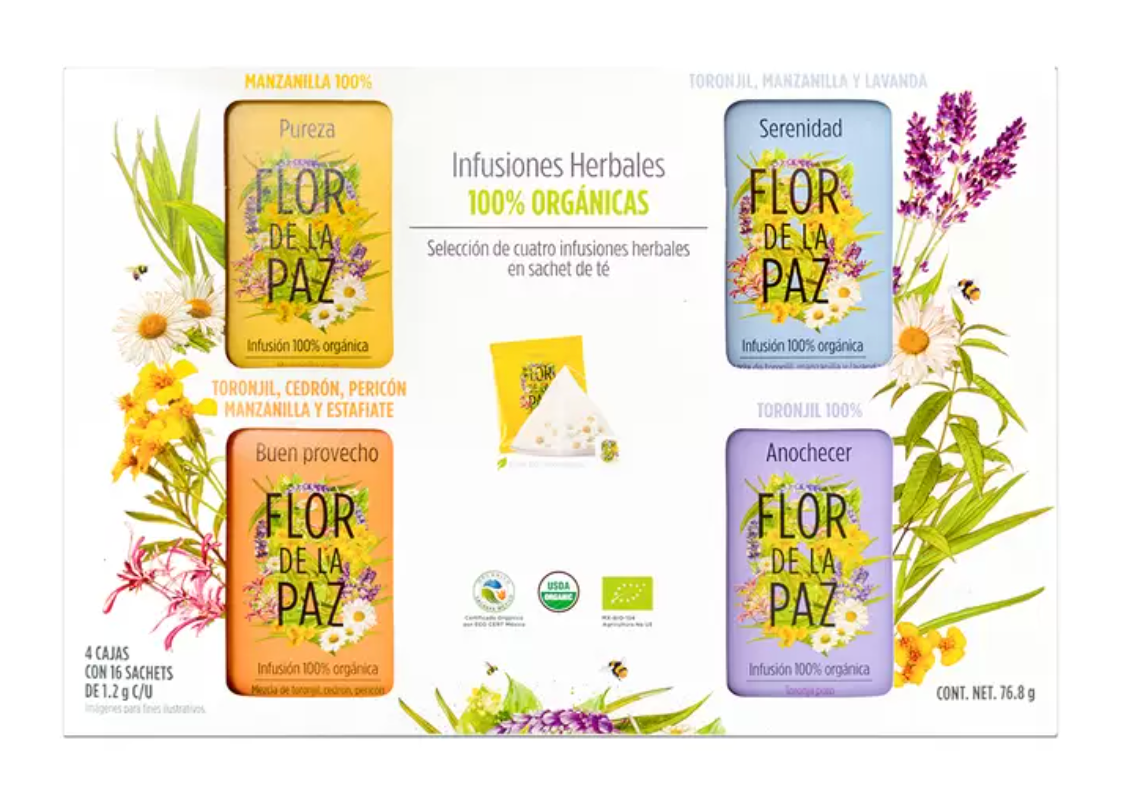 Selección de 4 cajas con 16 sachets c/u de té orgánico. + Pureza: Manzanilla 100% + Serenidad: Toronjil, Manzanilla y Lavanda + Anochecer: Toronjil + Buen Provecho: Toronjil, Cedrón, Pericón, Manzanilla y Estafiate - Té orgánico, 100% natural y puro. Producto orgullosamente mexicano - Libre de Cafeína - Libre de transgénicos - Sin Saborizantes - Producto Orgánico - Agricultura regenerativa - Proyecto Social y Solidario - Alternativa saludable a bebidas azucaradas - Fortalece el sistema inmunológico y digestivo - Ayuda a relajarse por su alta concentración de aceites esenciales Flor de la Paz es un modelo de Agri-Cultura y Api-Cultura 100% orgánico y sustentable, cuyo objeto es la generación de empleo, salud y educación, para mejorar la calidad de vida de las comunidades vulnerables de México. Todas las utilidades generadas por la venta de este producto se reintegran al modelo social para la proliferación del bien común.