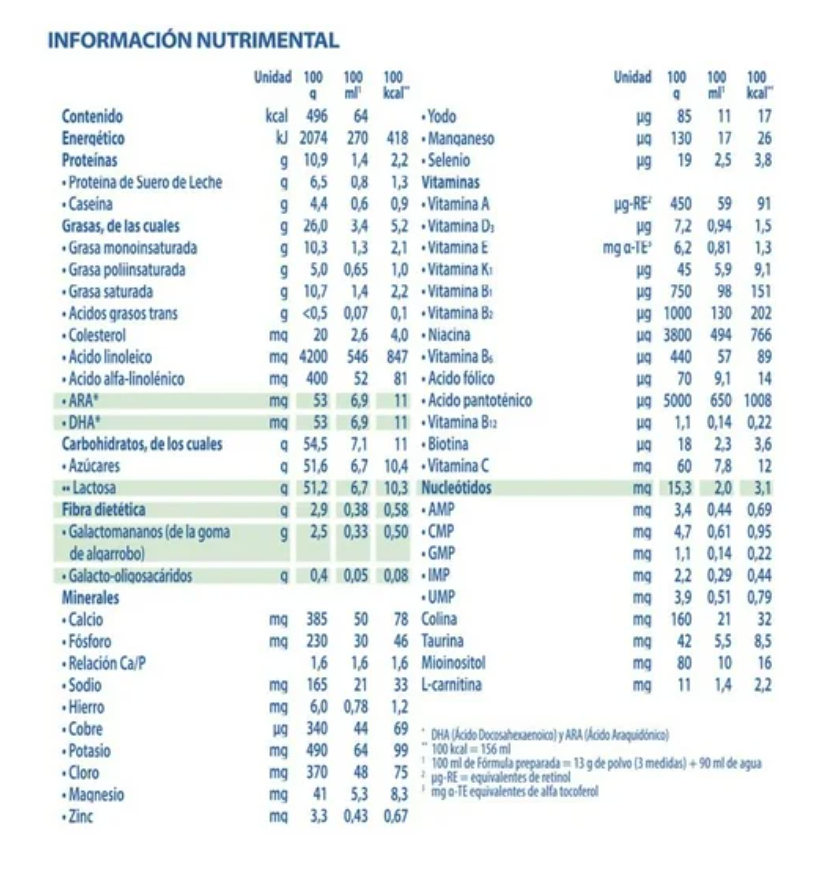 Contiene nutrientes para apoyar el desarrollo físico y mental de tu hijo partir del nacimiento, como Prebióticos y Probióticos, DHA, ARA, proteína hidrolizada, fibra, hierro, etc.
