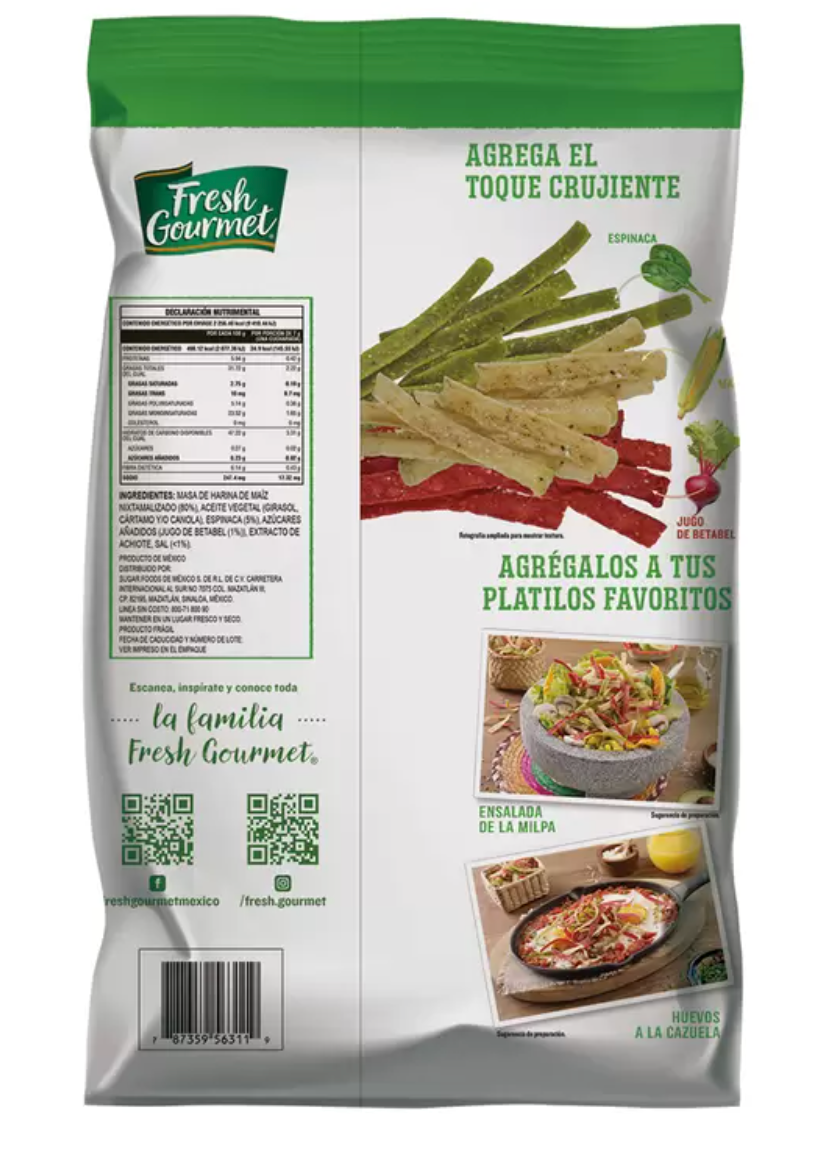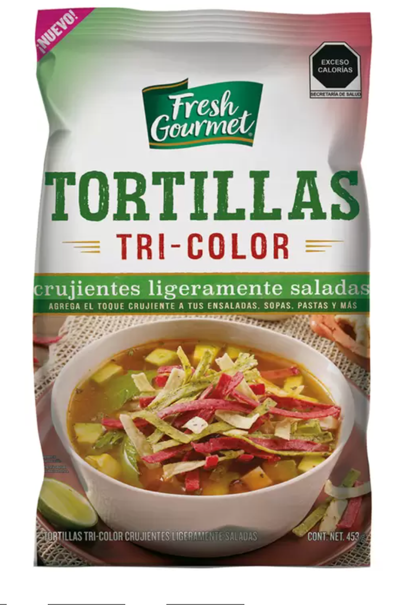 Lleva tus sopas, ensaladas, desayunos o snacks al siguiente nivel, con este nuevo topping que Fresh Gourmet tiene para ti, son tiras de tortillas tricolor crujientes, con inclusión de espinacas y juego de betabel, le darán ese toque colorido y divertido a tus platillos. Ideales para tu guacamole, enchiladas, sopa azteca y más...