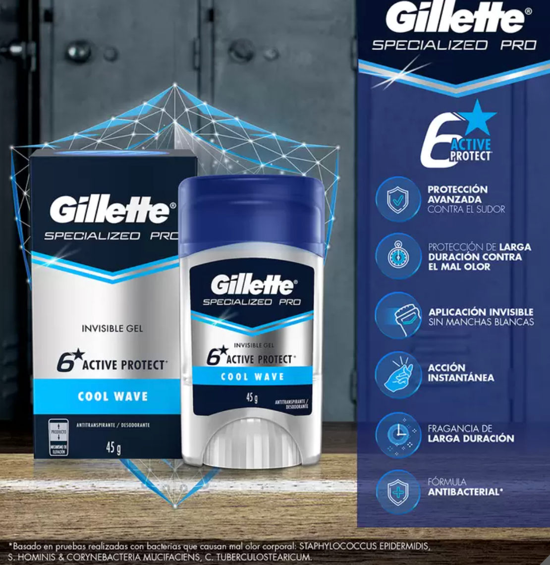 Mantente fresco y protegido con el antitranspirante Gillette Specialized Pro Gel Invisible, que con su sistema Active Protect te ofrece protección avanzada contra la sudoración excesiva y mal olor en las axilas, sin manchas blancas en la aplicación. Prueba su fragancia de larga duración con notas cítricas y de melón; en una base almizcle.