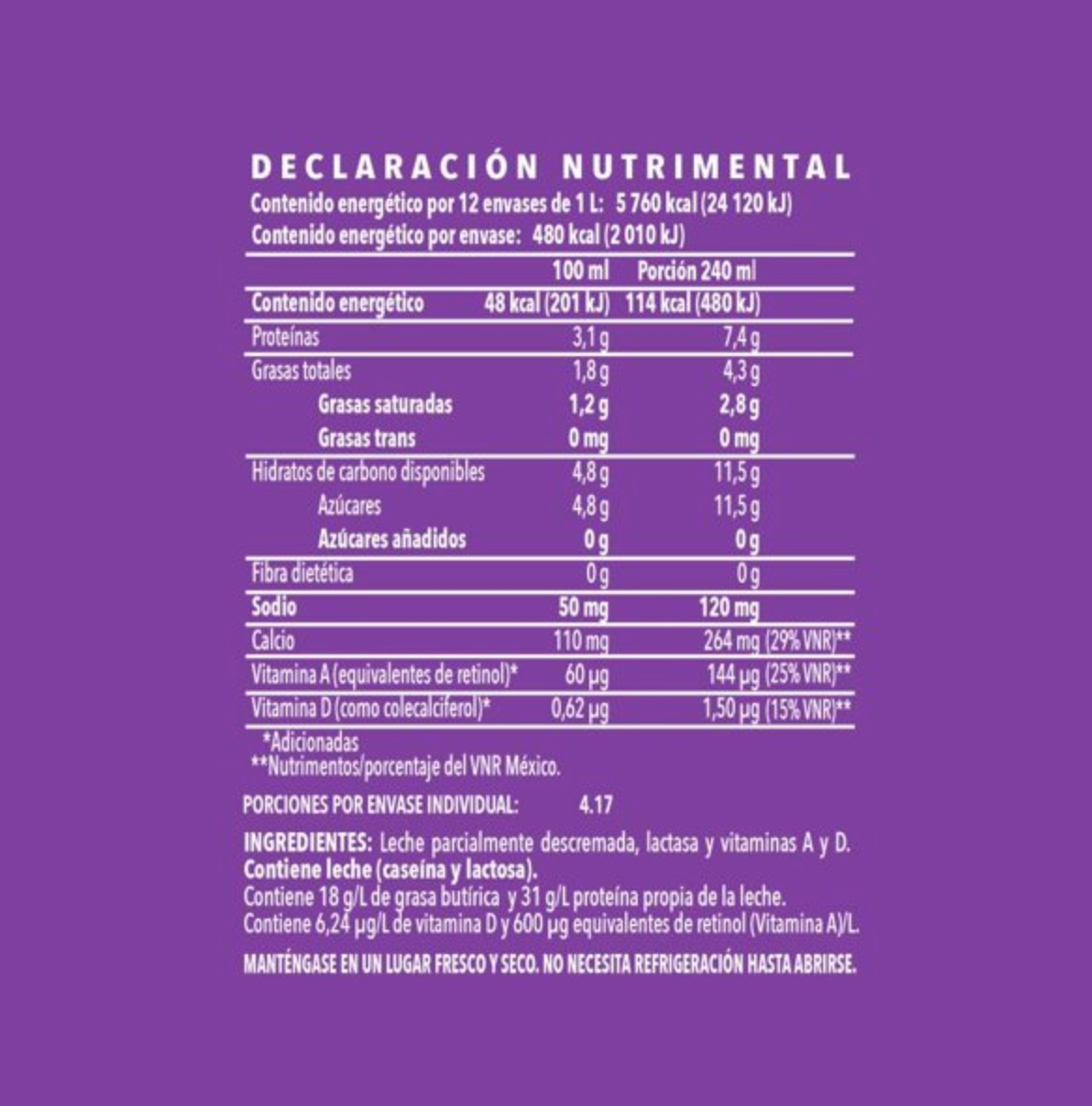 - Ultrapasteurizada adicionada con Vitaminas A y D