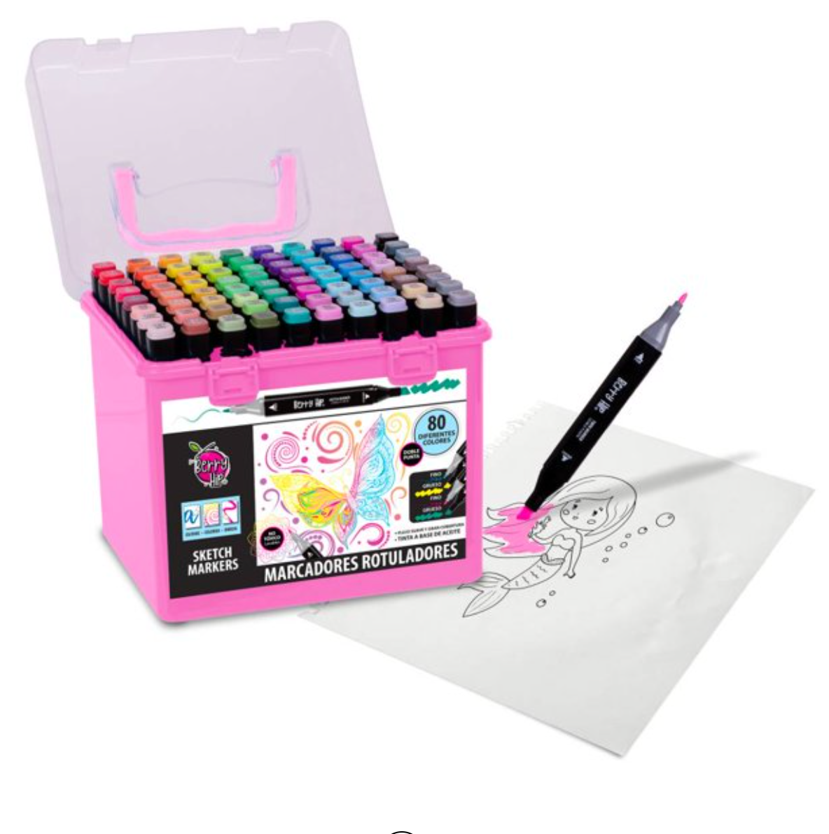 80 marcadores doble punta a base agua; crea sofisticados dibujos con toda la gama de colores que incluye; además de poder transportarlos de manera divertida en su estuche de pvc. Ayuda a los niños a mantenter su imaginación en todo momento.