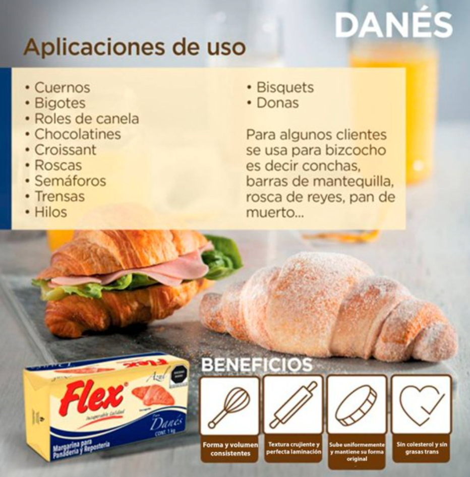 Flex es una marca que se preocupa por que prepares tus recetas con ingredientes de la mejor calidad y esta Margarina será ideal para que tus panes daneses tengan un sabor y aroma únicos.