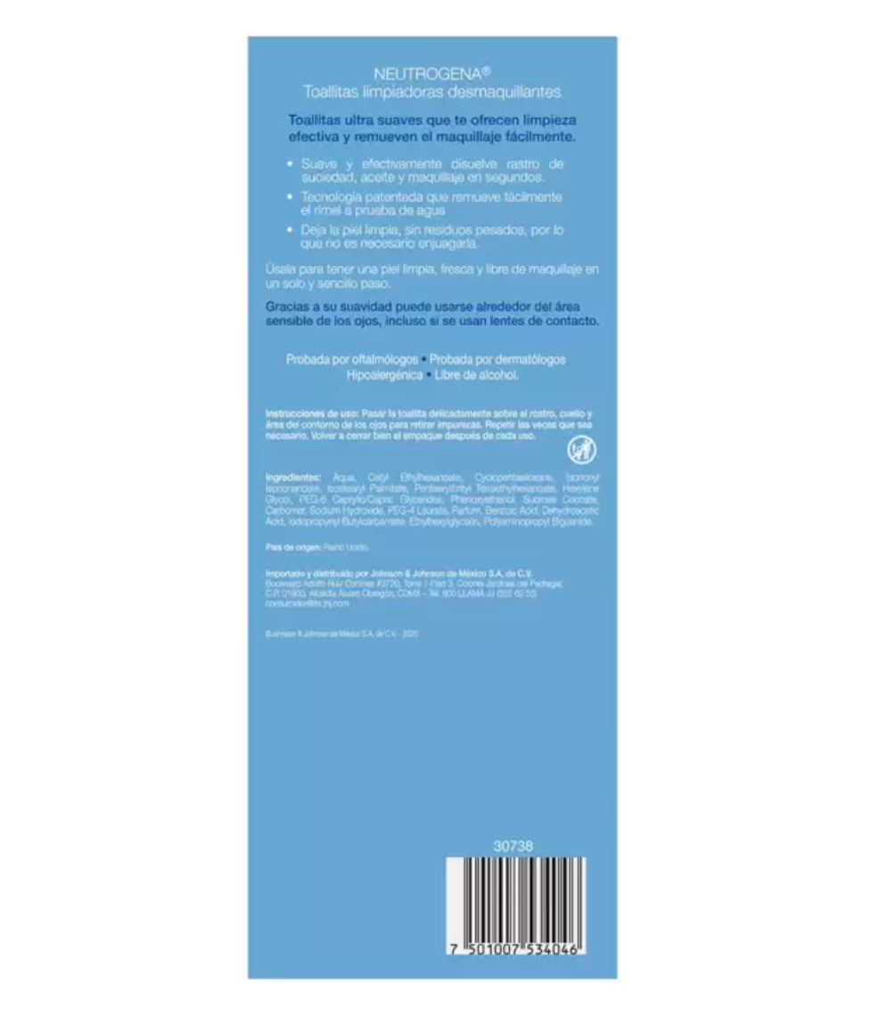 Las toallitas desmaquillantes NEUTROGENA® remueven 99% del maquillaje, disuelven todos los rastros de suciedad, exceso de grasa y maquillaje de manera suave y efectiva en un solo paso. Su exclusiva tecnología remueve fácilemente la máscara de pestañas a prueba de agua, dejando la piel completamente limpia y libre de residuos. Con textura ultra suave, para todo tipo de piel. Dermatológicamente y oftalmológicamente probadas, hipoalergénicas, probadas contra alergias y libres de alcoholes.