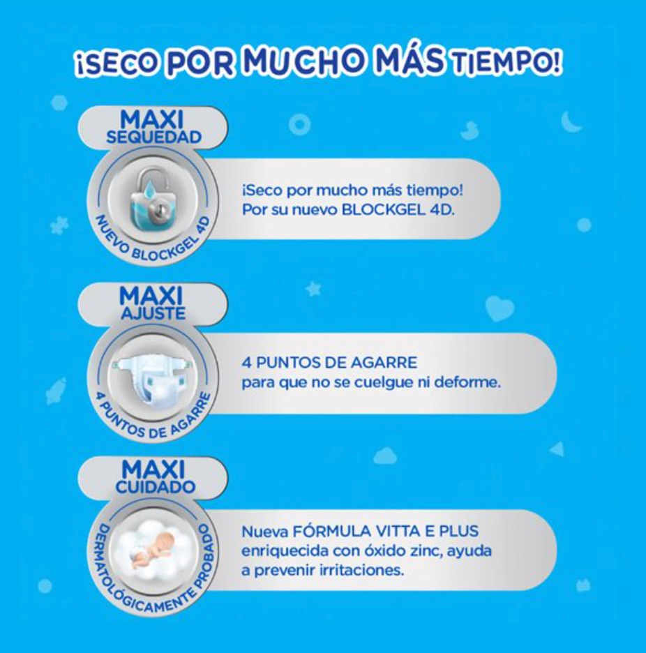 - Maxi Cuidado: Nueva fórmula Vitta E Plusenriquecida con Óxido de Zinc que ayuda a prevenir irritaciones en la piel.