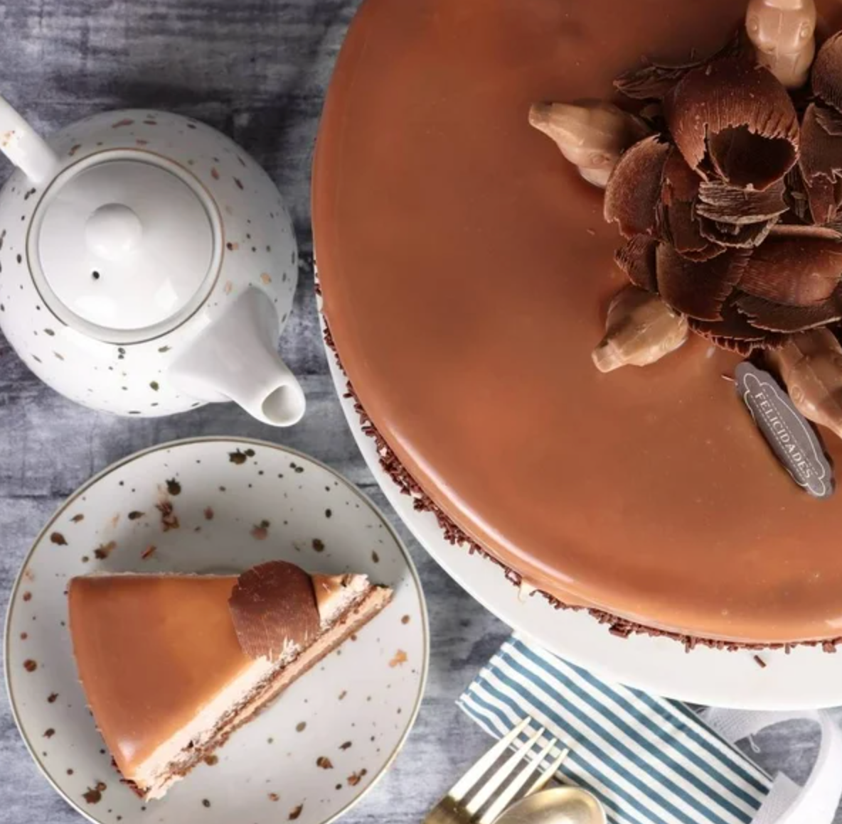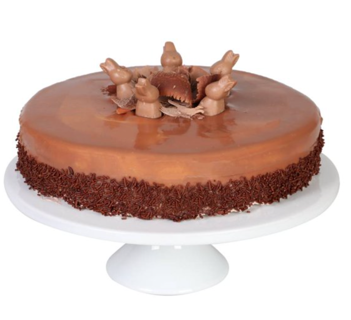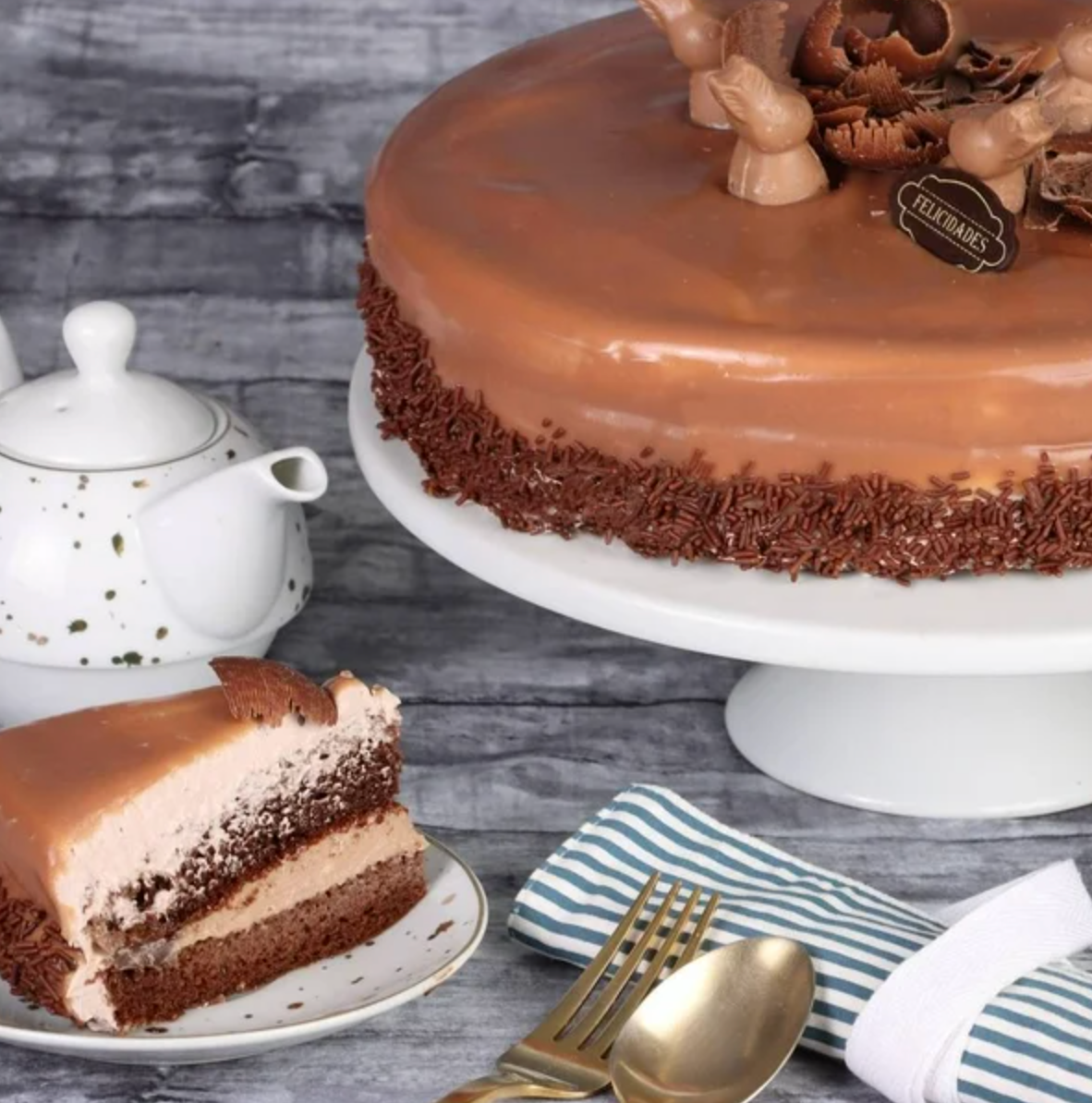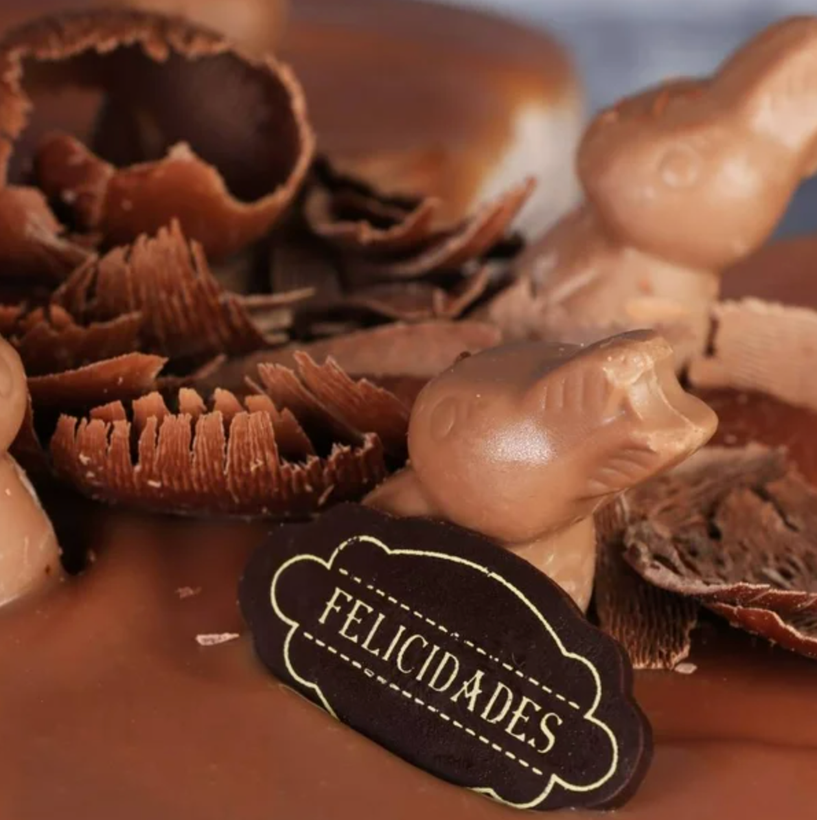 Con 2 capas de pan sabor a chocolate y 2 bases de mousse de chocolate en su interior se encuentra decorado con una cobertura sabor a chocolate, decorado con granillo y 5 deliciosos conejitos Turin.