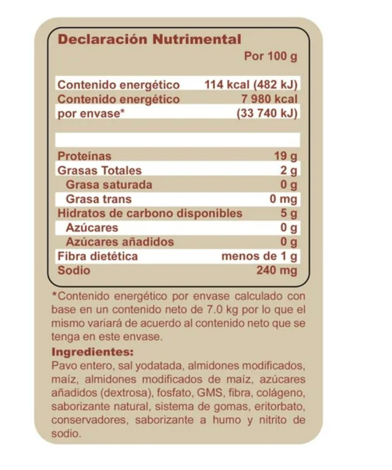 El pavo está completamente cocido y listo para comer. Se puede usar en recetas que requieren pavo cocido sin calentamiento previo. Su color rosado proviene del ahumado y el cuadro.