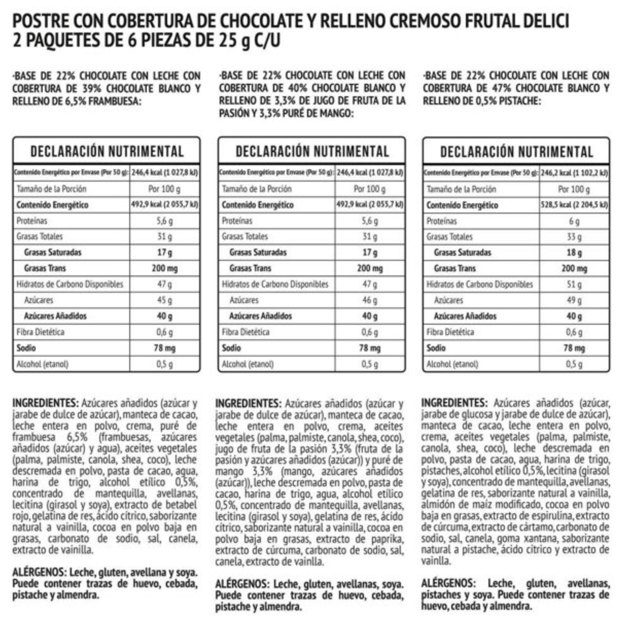 Postre con Cobertura de Chocolate y Relleno Cremoso Frutal Delici 12 pzas de 25 g c/u -.