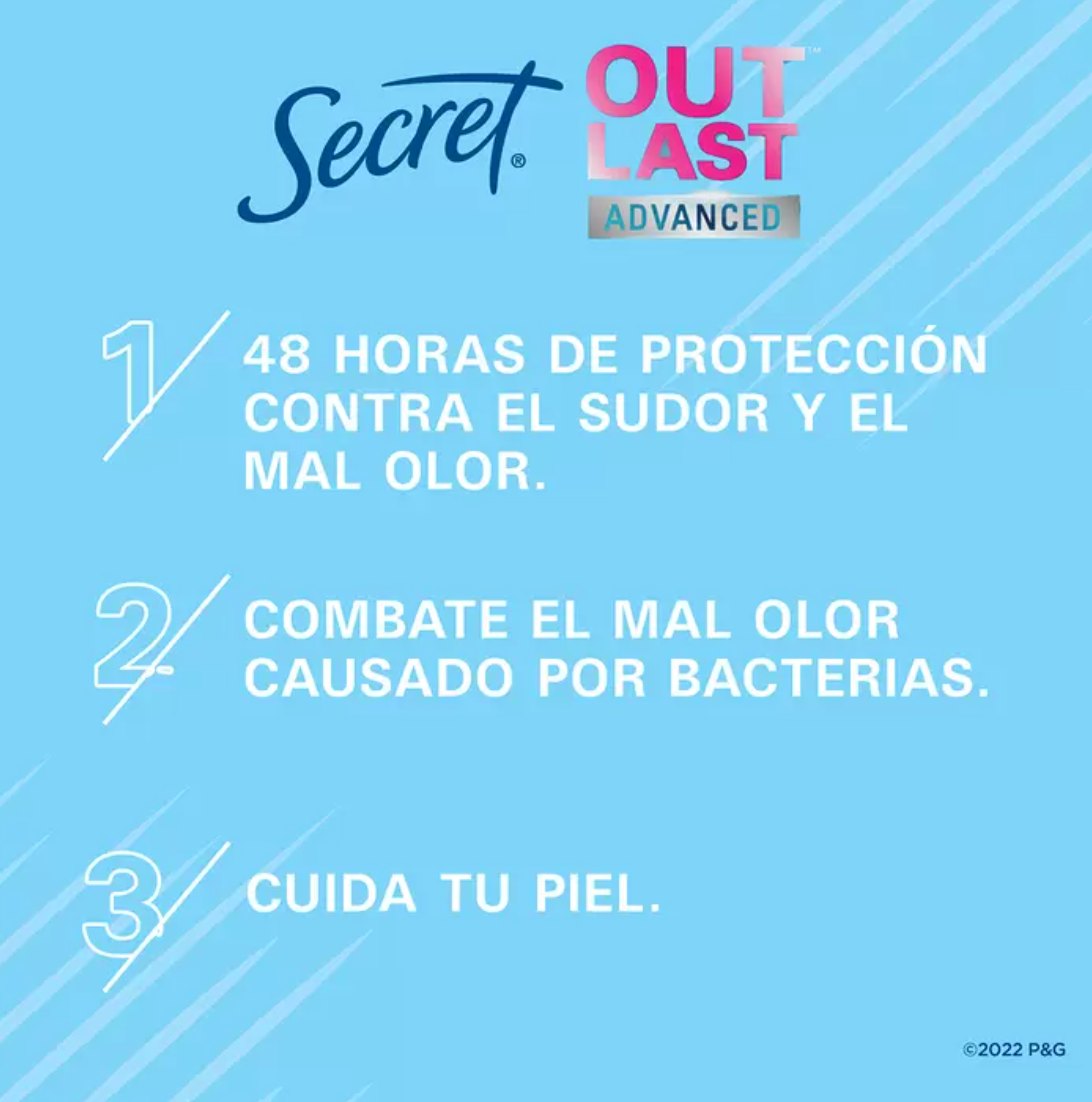 Siéntete Protegida y Fresca todo el día con el antitranspirante y desodorante Secret Outlast Advanced, que combate activamente el sudor y el mal olor para una protección de 48 horas. El antitranspirante y desodorante avanzado Secret Outlast en barra, combate las bacterias que causan el mal olor y deja tu piel seca, suave y protegida. Además, Secret es una marca libre de crueldad certificada por PETA.