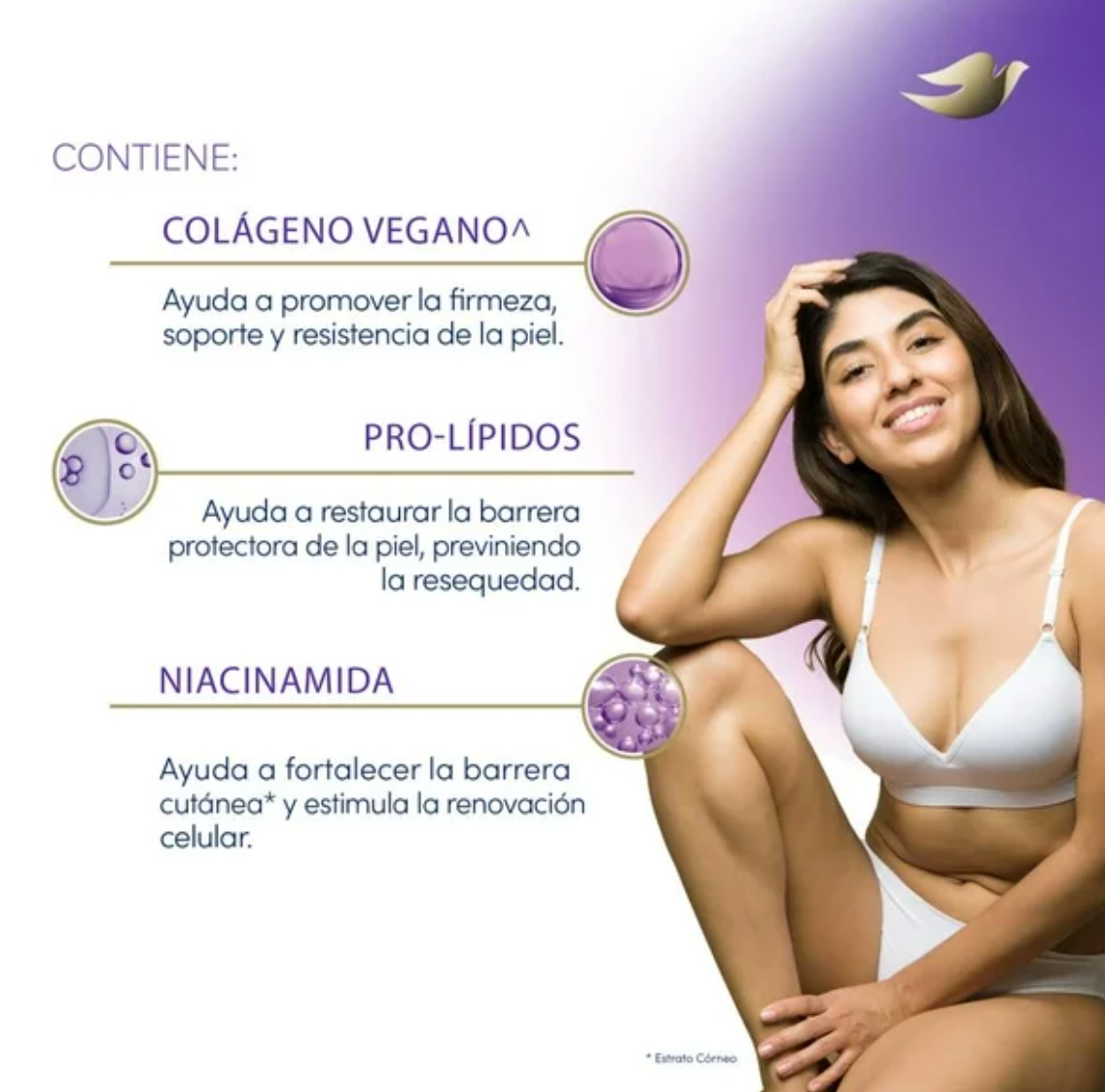 Sérum Corporal Dove Dermo Renovador Hialurónico con una exlusiva y avanzada tecnología que humecta profundamente* y actúa en sinergia con tu piel, ayudando a devolverle su suavidad y luminosidad. Repara y previene 5 signos de la resequedad: Aspereza, falta de brillo y elasticidad, descamación y tensión manteniendo tu piel humectada por 48 horas.
