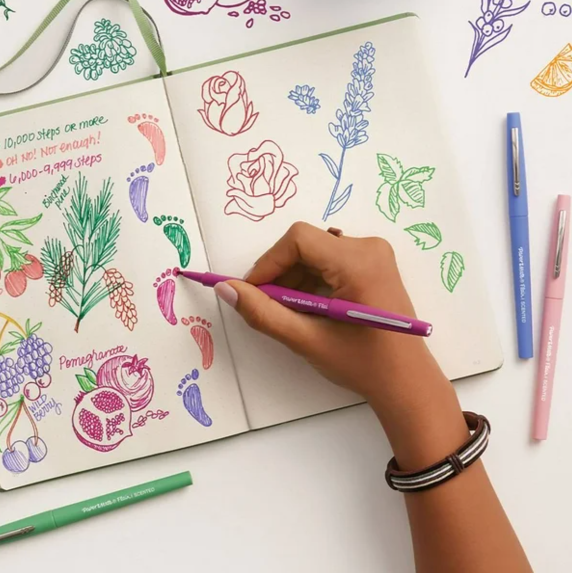 ¡Escápate a la naturaleza con esta colección de Bolígrafos PaperMate Flair Scented que cuentan con relajantes fragancias temáticas de la naturaleza y colores vibrantes! Estos brillantes bolígrafos Flair deleitarán tus sentidos con aromas ligeramente infusionados como Madreselva, Jazmín Azul, Lavanda y más. Expresa tu creatividad con los bolígrafos de punta de fieltro Flair que no traspasan el papel y cuentan con tinta resistente al desvanecimiento y a las manchas, para que tu trabajo permanezca ordenado. La tecnología Point Guard de Flair también evita que las puntas se deshilachen. ¡Date un momento para ti mismo con los Bolígrafos Paper Mate Flair Scented Nature Escape mientras coloreas, tomas apuntes y más!