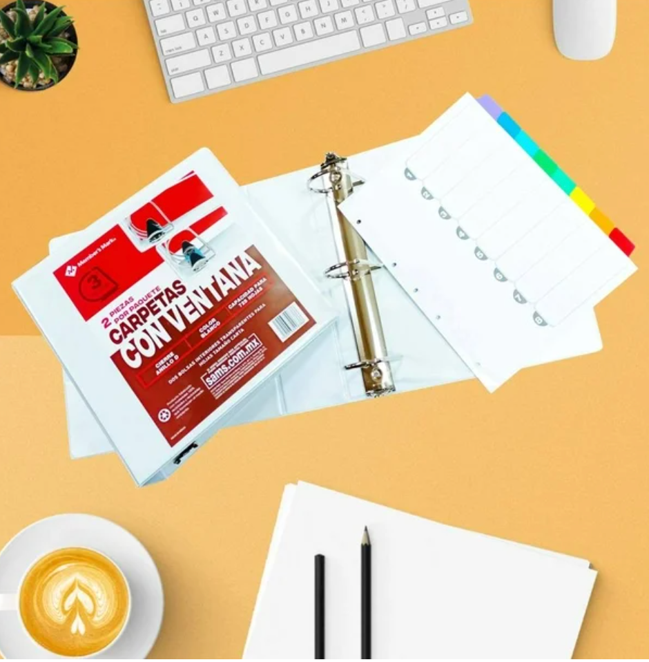 Carpeta marca Member's Mark de 3" tamaño carta, color blanco, con ventana transparente para personalizarla, arillo en "D" niquelado y dos bolsas internas donde podrás llevar credenciales, billetes, hojas, etc. fabricado con materiales reciclados y reciclables que favorecen al medio ambiente.