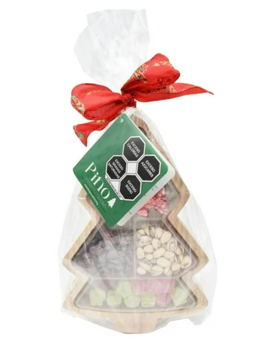Fantástico pino de madera con botanas ideal para obsequiar esta Navidad.