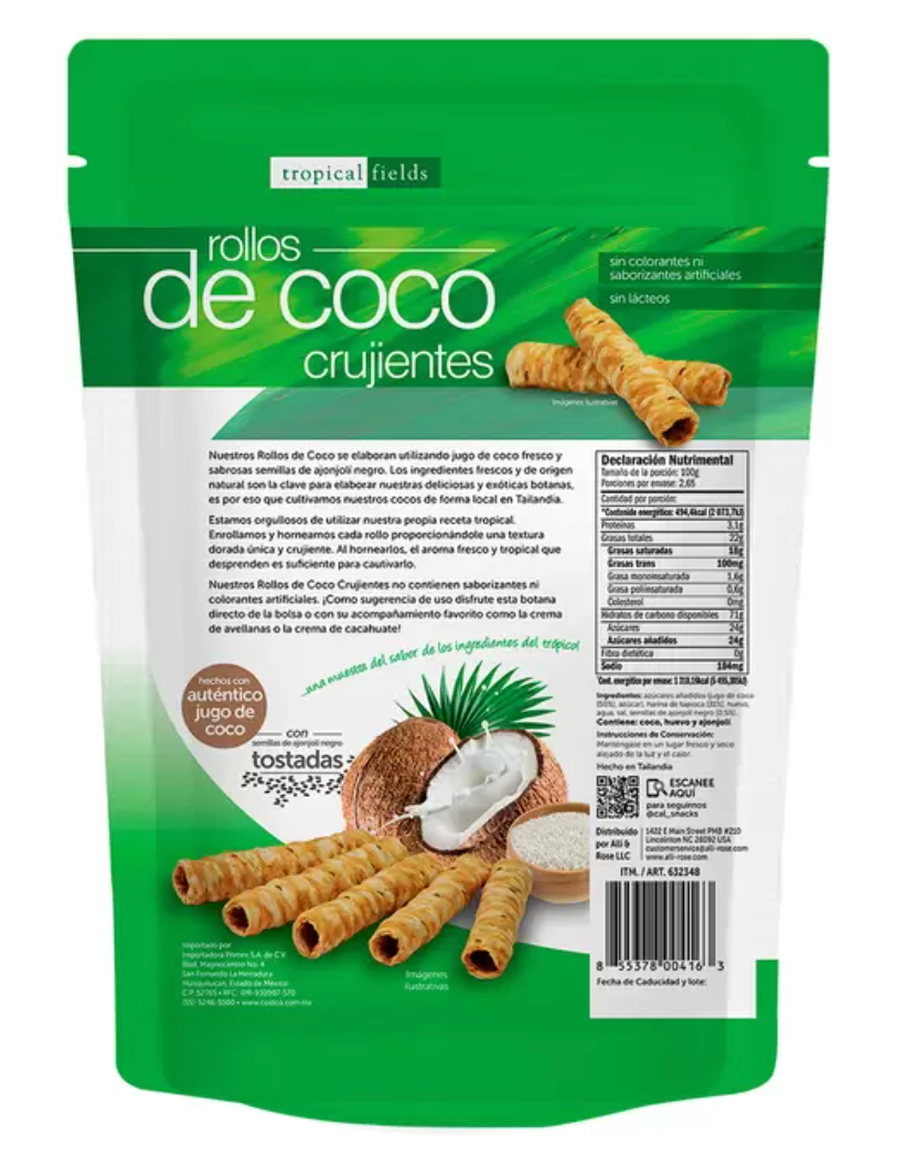Nuestros Rollos de Coco Crujientes no contienen saborizantes ni colorantes artificiales. ¡Como sugerencia de uso disfrute esta botana directo de la bolsa o con su acompañamiento favorito como la crema de avellanas o la crema de cacahuate!