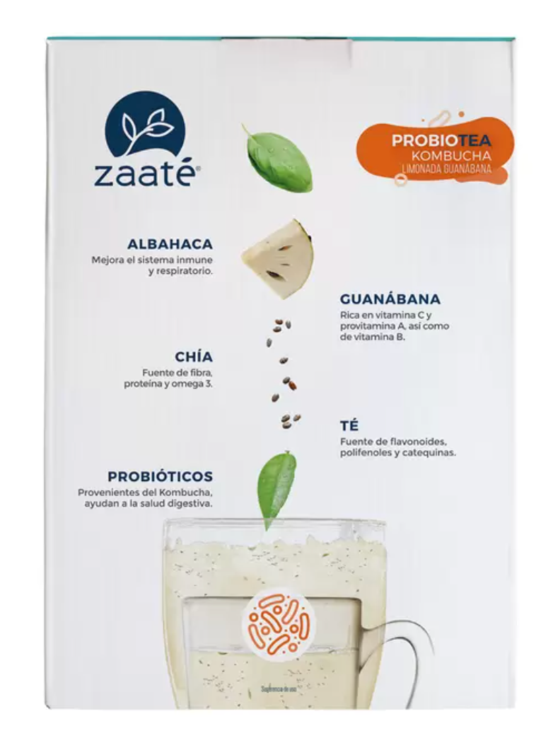 Zaaté con su línea PROBIOTEA trae para ti todos los beneficios del té verde y la Kombucha en una deliciosa y divertida bebida con semillas de chía y albahaca que te encantarán, con un delicioso y refrescante sabor a limón y guanábana. Cuidando el contenido calórico al estar endulzado con azúcar y estevia.