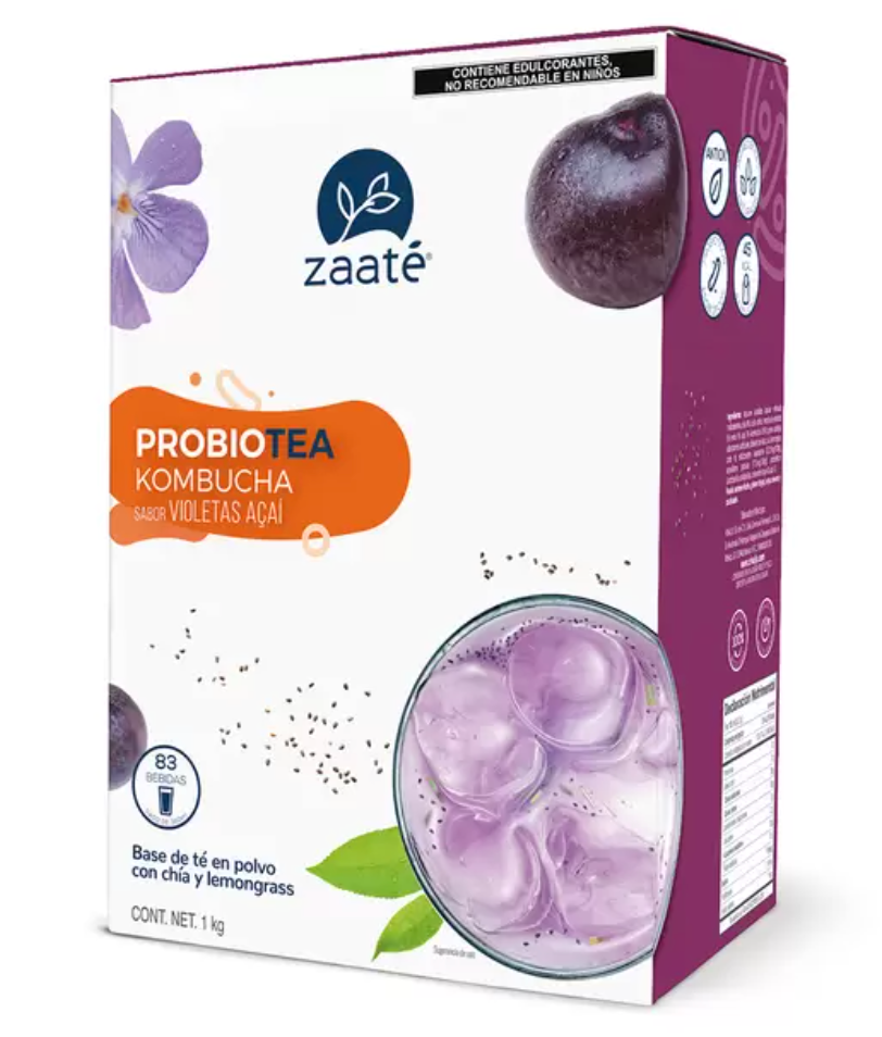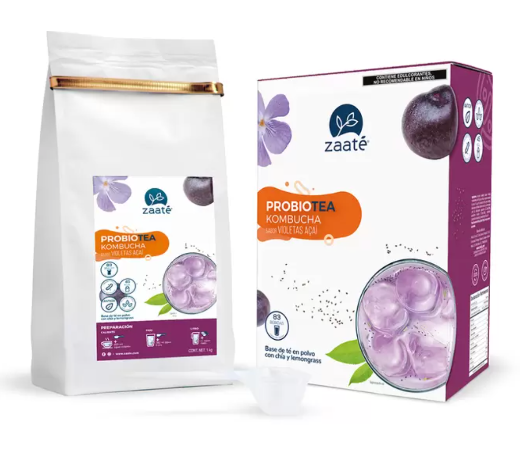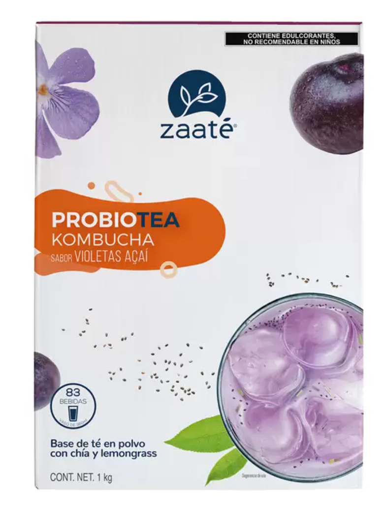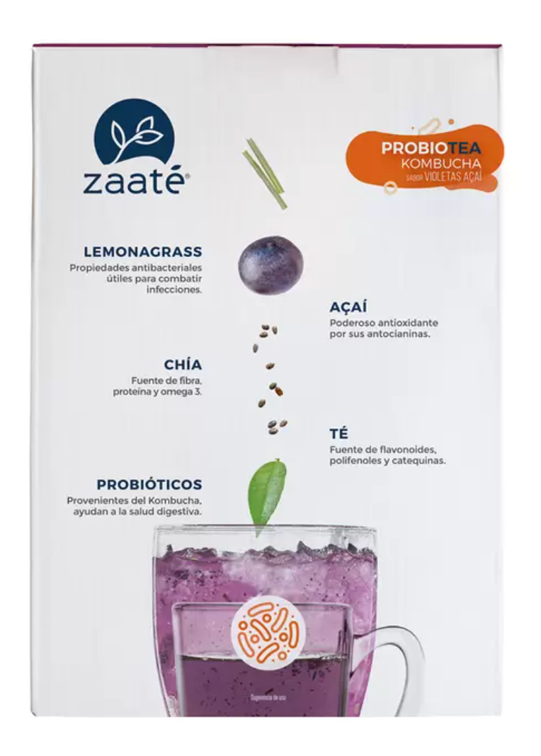Zaaté con su línea PROBIOTEA trae para ti todos los beneficios del té verde, la Kombucha y el Acai en una deliciosa y divertida bebida con semillas de chía y lemongrass que te encantarán, con un delicioso y refrescante sabor a violetas. Cuidando el contenido calórico al estar endulzado con azúcar y estevia.